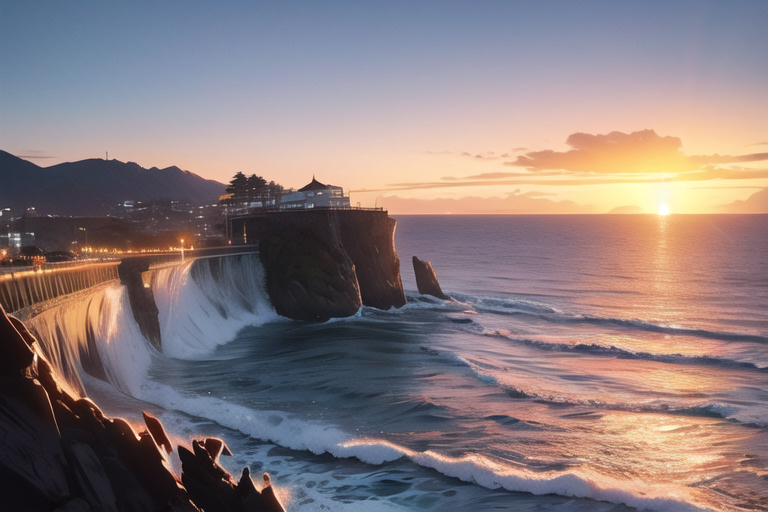 波が岩肌に打ち付けるダイナミックな景色が楽しめる。切り立った崖と荒々しい波の対比が印象的。湘南の絶景スポットとして知られ、多くの観光客が訪れる。夕暮れ時は特に美しく、水平線に沈む夕日を眺めることができる。